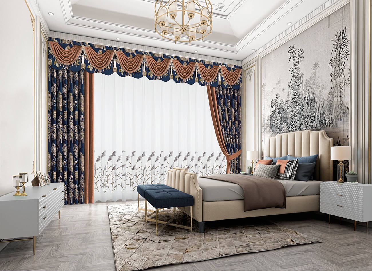 汲取花的靈感,綻放于面料之上,真實的筆觸靈活展現花的姿態,搭配背景墻,如踏入一片花海叢林,空間更加生動。