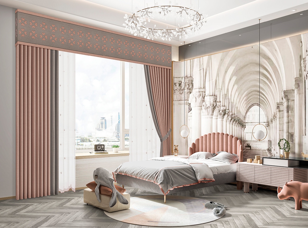 清新淡雅的茱萸粉讓整個家變得溫暖如春,當(dāng)迷人的茱萸粉遇上空間,充滿浪漫的氣息。搭配愛心花瓣圖案,增添現(xiàn)代都市感,甜美與雅致平衡地剛剛好。很好的詮釋了質(zhì)感并存的自由家居,描繪愜意舒適的居家生活。